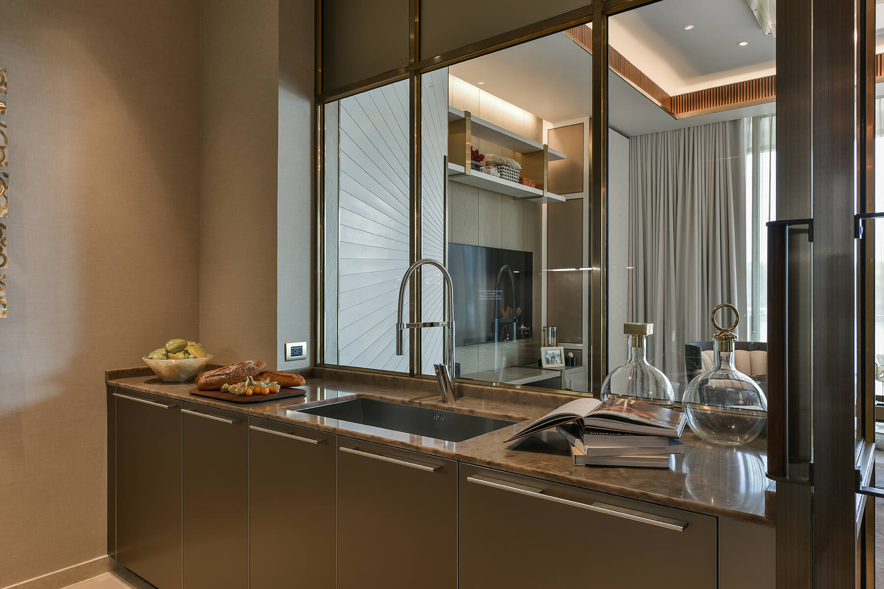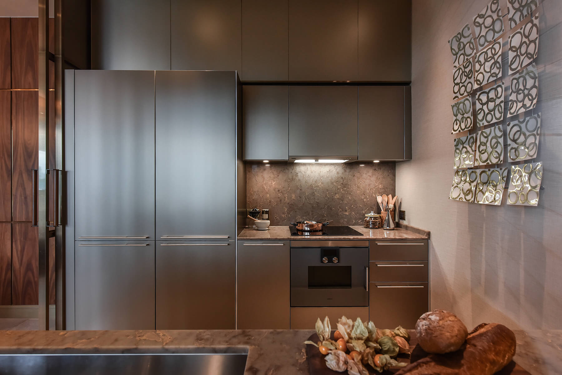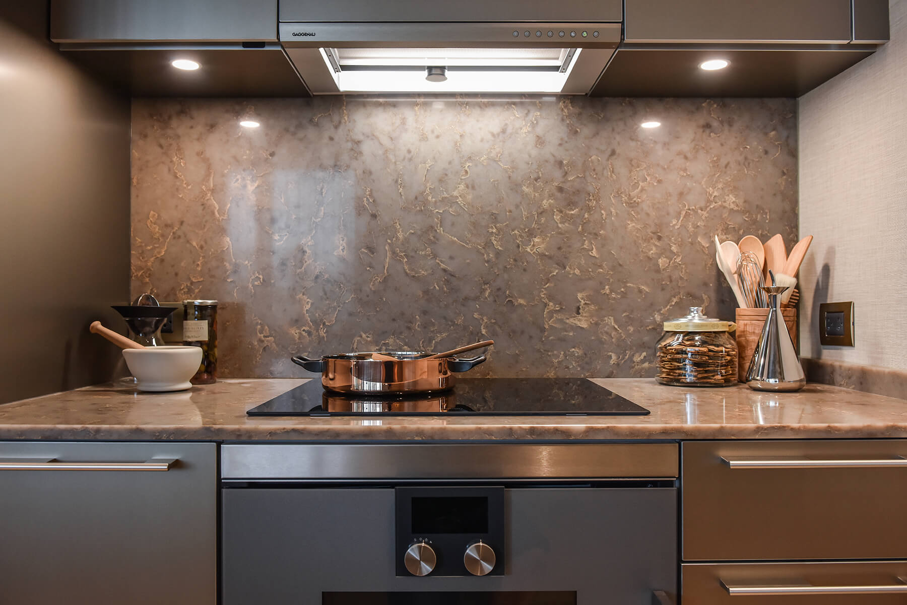 The bold onyx-effect pattern of the Artisan Wool countertops and splashback is the focal point of this luxurious Thai kitchen. The rich taupe palette creates a warm, velvety backdrop for the modern metallic units and gives the quartz centre stage. Light wooden, brass and chrome accessories fuse the contemporary with the traditional and balance light with dark.